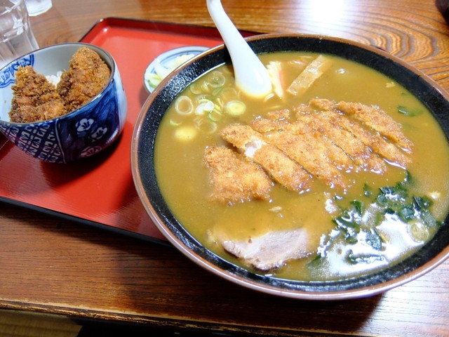 看板のデカ盛りメニューは名物のカツカレーラーメン。