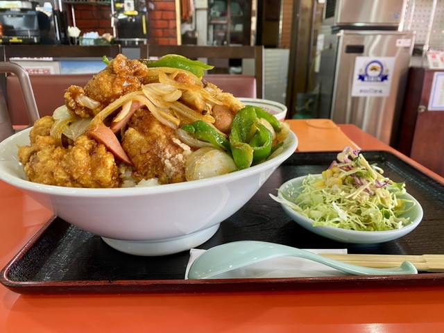 人気のデカ盛り丼は、器いっぱいに盛られたご飯の上に特大サイズの唐揚げ(ピリ辛炒め)をのせた丼で、見た目の迫力と満腹感が特徴です。