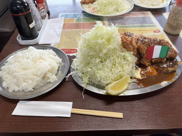 とんかつ・エビフライ・からあげ・ハンバーグが大皿に並び、山盛りのキャベツとご飯が添えられた迫力ある一皿に仕上がっています。