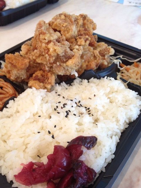 おすすめは唐揚げ弁当。存在感のある大ぶりの唐揚げが並び、ご飯とおかずを分けた二段仕様で食べ応えのある構成に仕上がっています。
