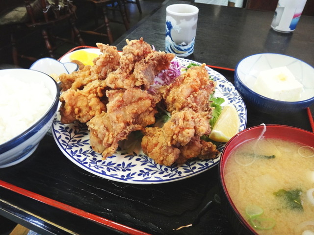 この店で特に人気の「チキンからあげ定食」は、程よいサクサク感の衣とジューシーな鶏肉が魅力。