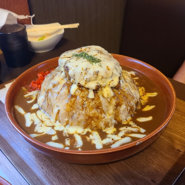 店自慢の「チーズハンバーグカレー」は山盛りご飯に大きなハンバーグとたっぷりチーズが乗り、カレーの程よい辛さとチーズのコクが相性抜群でしっかり食べ応えがあります。