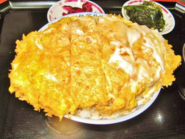 名物は丼からはみ出す「カツ丼」で、ご飯をたっぷり盛り厚切りカツを玉子でとじた満足度の高い一杯。