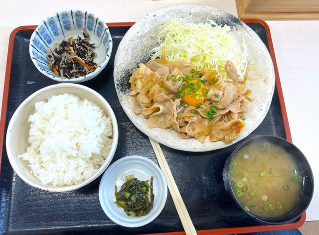 おすすめはスタミナ定食で、醤油味で炒めた豚肉のうえに生玉子をのせた一皿。