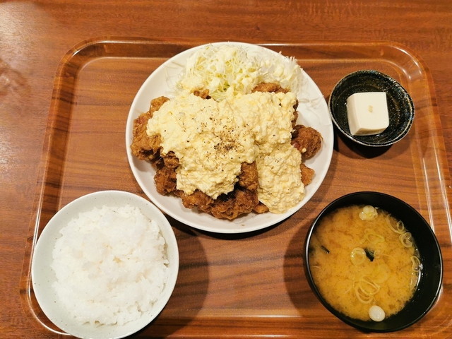 中でもおすすめは チキン南蛮定食。大ぶりに揚げられた唐揚げが複数枚盛られ、甘酢と相性の良いタルタルソースがたっぷりとかかり、ご飯が進む味わいです。