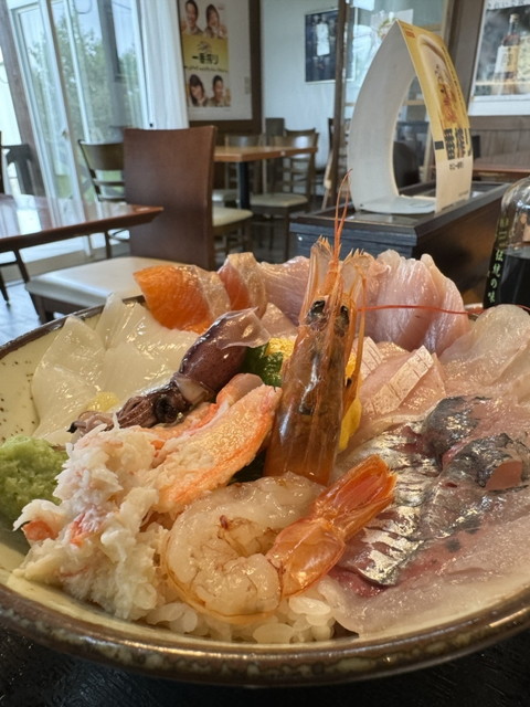 人気の海鮮丼は、地元で朝獲れされた魚をたっぷりと載せた贅沢な一皿で、ネタの種類が豊富で彩りも鮮やか。